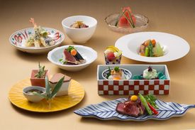 その9高台にある下田東急ホテルにある和洋折衷料理のレストラン。落ち着いた雰囲気でくつろいで過ごせる内装となっています。大きな窓からは海が広がる絶景を眺めることが可能で、特別な日のランチやディナーに最適です。フレンチと和食の料理人が手掛ける和、洋折衷の下田キュイジーヌをいただけます。
